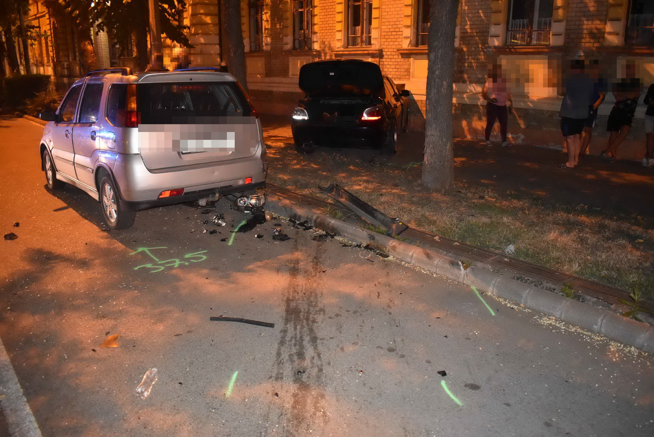 A védett úton közlekedő autó az ütközéstől érintőlegesen nekiütközött egy közúti jelzőtáblának, majd tovább sodródva az út szélén parkoló személygépkocsinak, végül az egyik út melletti ingatlan falának ütközve állt meg.