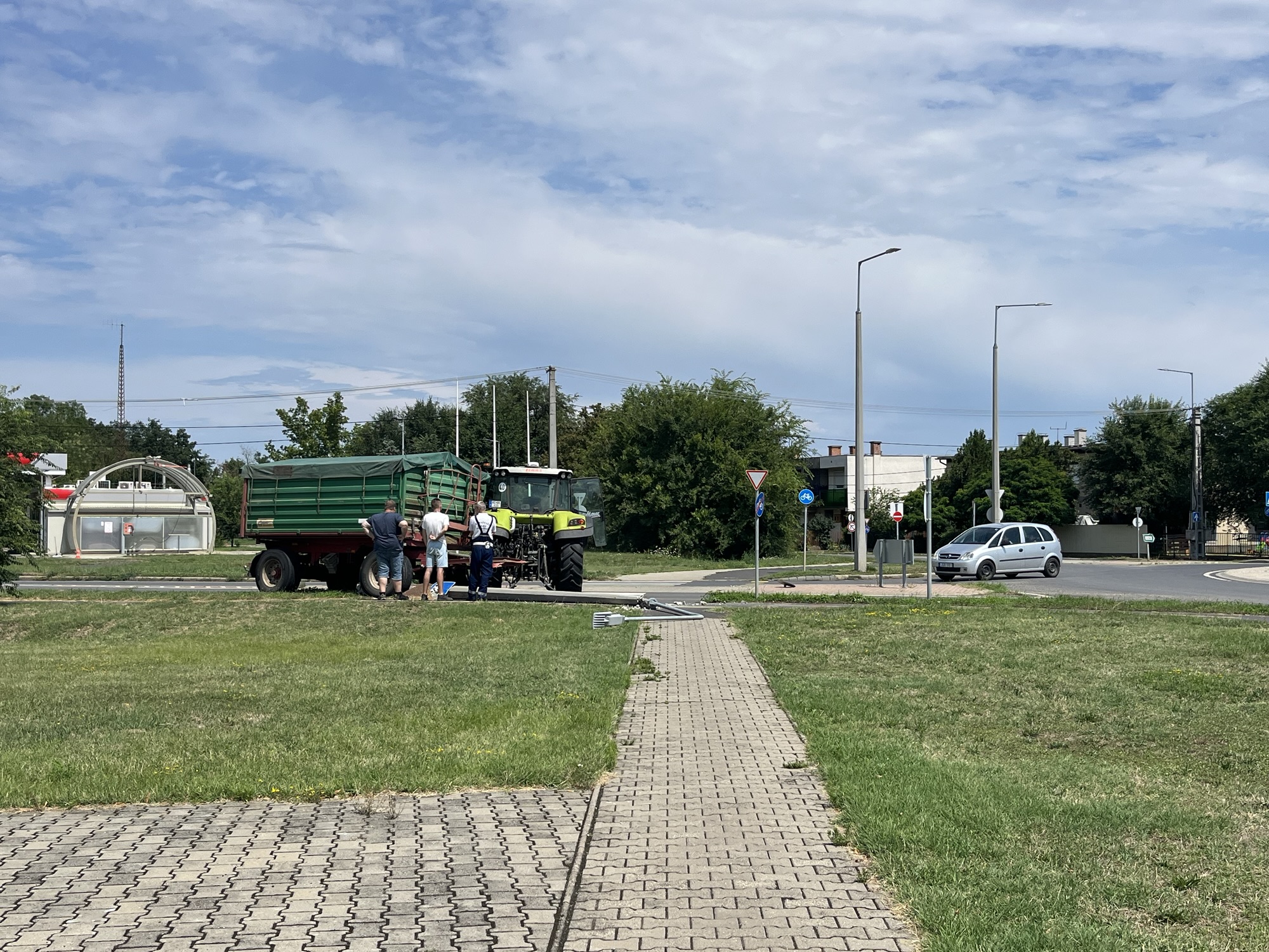 Karcagon a Madarasi útnál lévő körforgalom Karcag felé menő sávját foglalja el az traktor és vontatmánya, ami valószínű vezetéstechnikai hiba miatt kidöntött egy villanyoszlopot és jelzőtáblát.